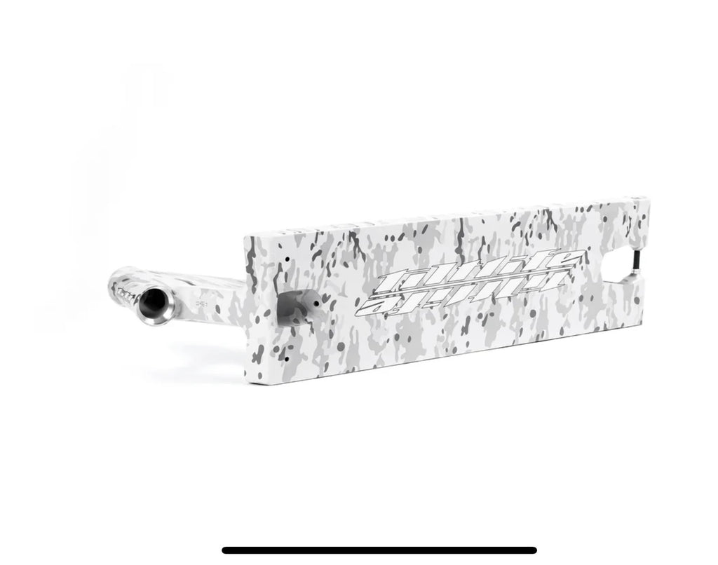 This deck has an almost fully cutout middle section on the bottom. This eliminates unneeded material for weight saving, but also provides a bit more flex to match the needs of high impact scooter riders.